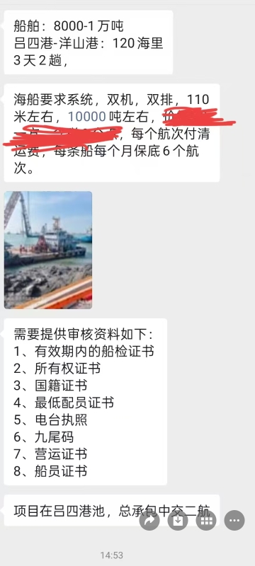 需要8000-13000吨海船或者江海两用船,双机双排。运沙子。启东港到洋山港120海里,26元一方开发票。长期运,二年工期。有船资源的联系我...