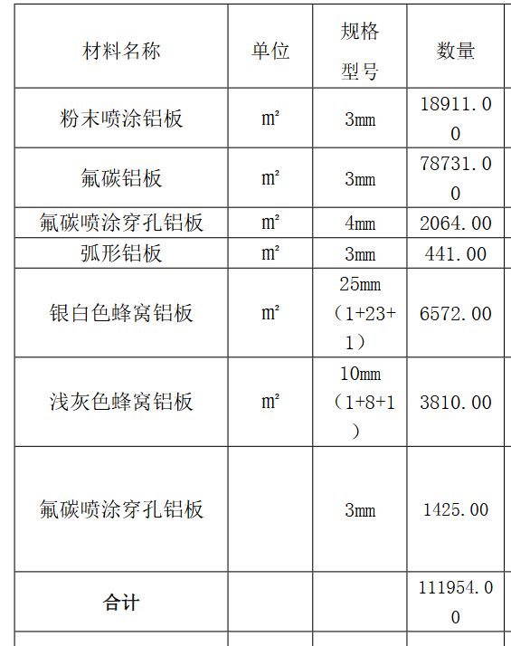 | 项目描述 | 1、浙江嘉兴幕墙工程采购一批铝板材料,主要包含3mm粉末喷涂和氟碳铝板,3/4mm氟碳喷涂穿孔铝板,3mm弧形铝板,蜂窝铝板等。 2、付款方式月结算80%,供货安装完成2个月支付总货款的10%,验收合格付至97%,具体要求见清单,采购联系人:叶总。 |