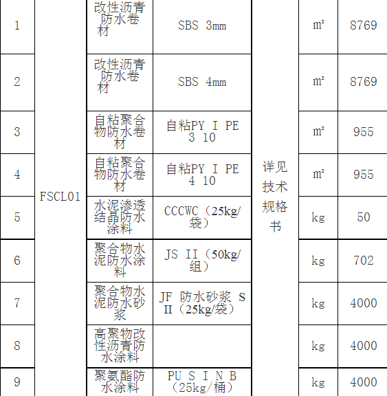 | 项目描述 | 陕西西安铁路工程防水、保温材料采购计划; 采购内容:8769㎡的SBS3mm/4mm改性沥青防水卷材、955㎡自粘PYIPE310、水泥渗透结晶防水涂料50kg、聚氨酯防水涂料4000kg、厚80mm阻燃A级密度小于150kg/m3的憎水岩棉、厚100mm聚能防火保温板G型等清单内全部防水物资,联系人:张总; |
