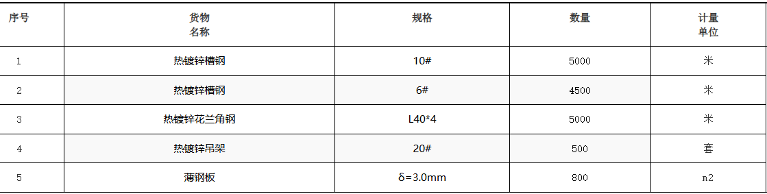 | 项目描述 | 陕西延安热电厂主厂房安装工程采购钢材,主要包含6#10#热镀锌槽钢,L40*4热镀锌花兰角钢,20#热镀锌吊架,3.0mm薄钢板,具体采购数量见清单,联系人:张经理。 |