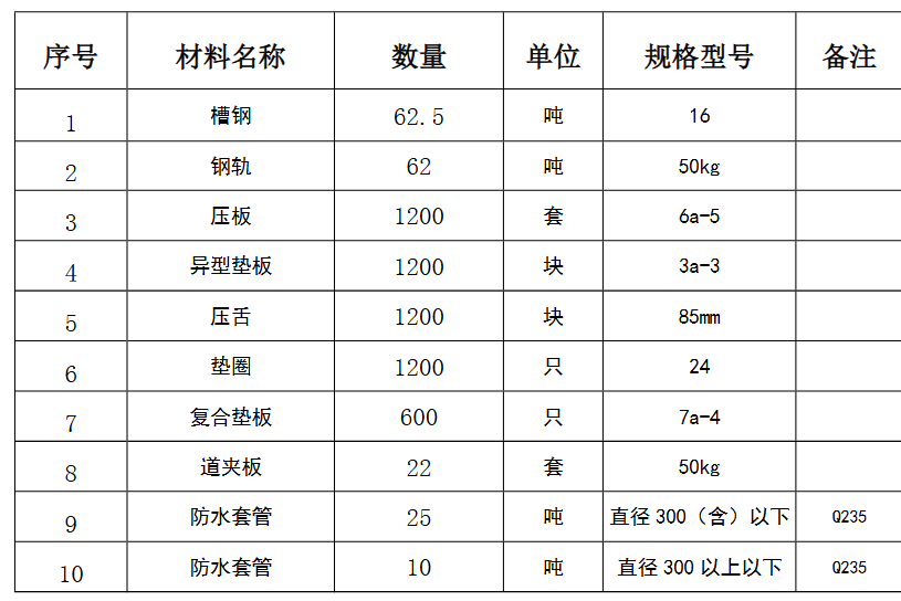 | 项目描述 | 新疆昌吉工业厂房建设项目需要采购一批钢材配件,主要包含16#槽钢62.5吨,钢轨62吨,压板,垫板,垫圈,防水套管等,具体规格数量请厂家参考清单报价合作,采购联系人:马经理。 |