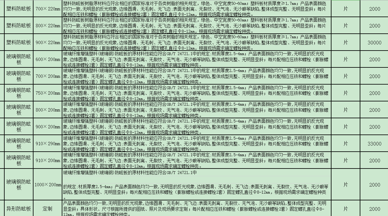 | 项目描述 | 云南高速公路养护工程,需要采购一批材料,主要要求如下: 塑料防眩板,尺寸600-900*220mm,材质厚度≥1.7mm,玻璃钢防眩板,尺寸600-1000*200mm,材质厚度2.5-4mm,和异形防眩板,需配膨胀螺栓或连接螺栓,固定螺孔直径φ8-12mm。 反光型和突起型路面标线涂料,玻璃珠,彩色路面骨料,聚甲基丙烯酸甲脂等装饰涂料,具体参数要求见清单,联系人:李工。 |