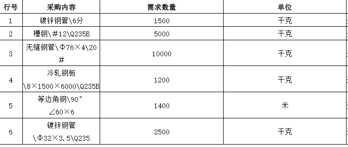 | 项目描述 | 辽宁沈阳钢结构工程急需钢材一批,包含镀锌钢管,槽钢,冷轧钢板,等边角钢,具体规格及采购数量见清单,联系人:李工。 |