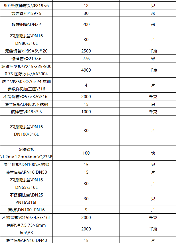 | 项目描述 | 广西贺州车间检修工程采购钢材,主要包含有镀锌钢管,无缝钢管,900行波纹压型彩钢板,不锈钢管,花纹钢板,角钢,不锈钢法兰,镀锌三通等材料,具体规格见清单,交货时间一周,联系人:赵工。 |