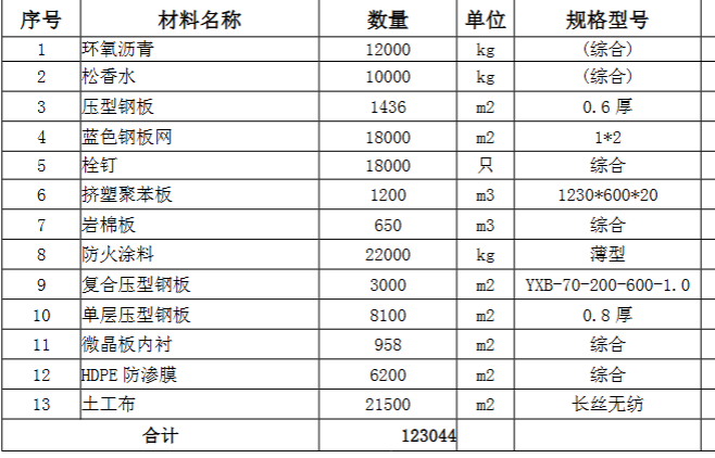 0.6mm厚压型钢板,600型复合压型钢板,0.8厚单层压型钢板等彩钢板,1*2蓝色钢板网,栓钉,挤塑聚苯板,岩棉板等保温材料,环氧沥青,防火涂料等涂料,具体采购数量见清单,联系人:马工。