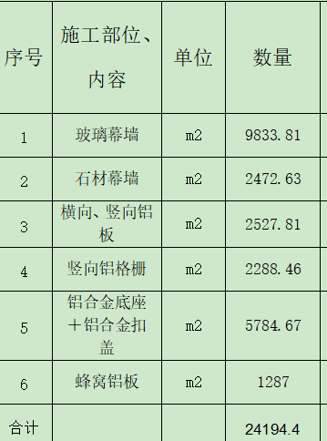 | 项目描述 | 浙江嘉兴3#楼幕墙装饰工程分包,建筑面积24194.4平方,主要施工内容包含:玻璃幕墙,石材幕墙,横向、竖向铝板,竖向铝格栅,铝合金底座、铝合金扣盖,蜂窝铝板等,具体工程量参考清单图纸,项目联系人:叶总。 |