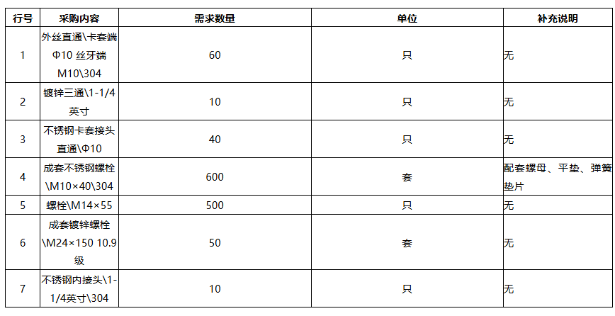 | 项目描述 | 广东汕尾项目螺栓配件采购计划,包含M10外丝直通,材质304不锈钢,镀锌三通,不锈钢卡套接头,成套不锈钢螺栓,规格M10×40,M14×55螺栓,成套镀锌螺栓,规格M24×150 10.9级,不锈钢内接头等,具体规格数量见清单,采购联系人:蒙经理。 |