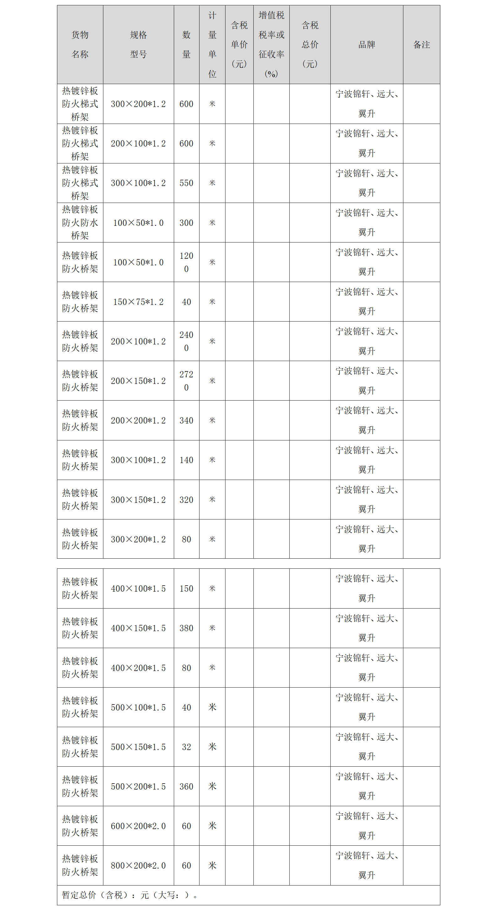浙江宁波镇海区安置房建设项目,水电安装工程需要采购一批材料,主要包含有热镀锌板防火梯式桥架,热镀锌板防火防水桥架,热镀锌板防火桥架,规格多种,具体采购要求见清单,品牌要求限定宁波锦轩、远大、翼升,请厂家联系报价合作,采购人:符经理。