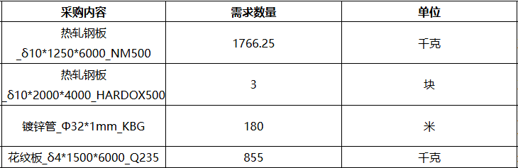 | 项目描述 | 海南昌江环保工程采购钢材一批,包含热轧钢板规格10*1250*6000mm,材质NM500,10*2000*4000mm,材质HARDOX500,镀锌管Φ32*1mm,花纹板4*1500*6000,材质Q235B,联系人:吴经理。 |