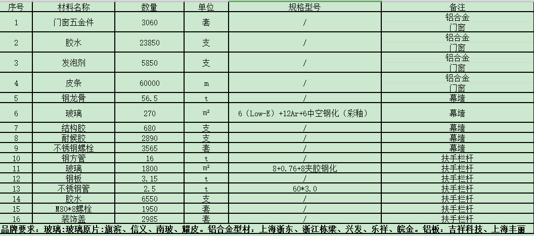 | 项目描述 | 浙江宁波幕墙门窗安装工程材料采购计划,主要需求如下: 包含有铝合金门窗五金件,幕墙钢龙骨,中空玻璃,结构胶,耐候胶,不锈钢螺栓,扶手栏杆钢方管,夹胶钢化,不锈钢管,螺栓等。 玻璃品牌要求旗滨、信义、南玻、耀皮,铝合金型材品牌要求上海浙东、浙江栋梁、兴发、乐祥、皖金,具体要求见采购清单,联系人:王工。 |