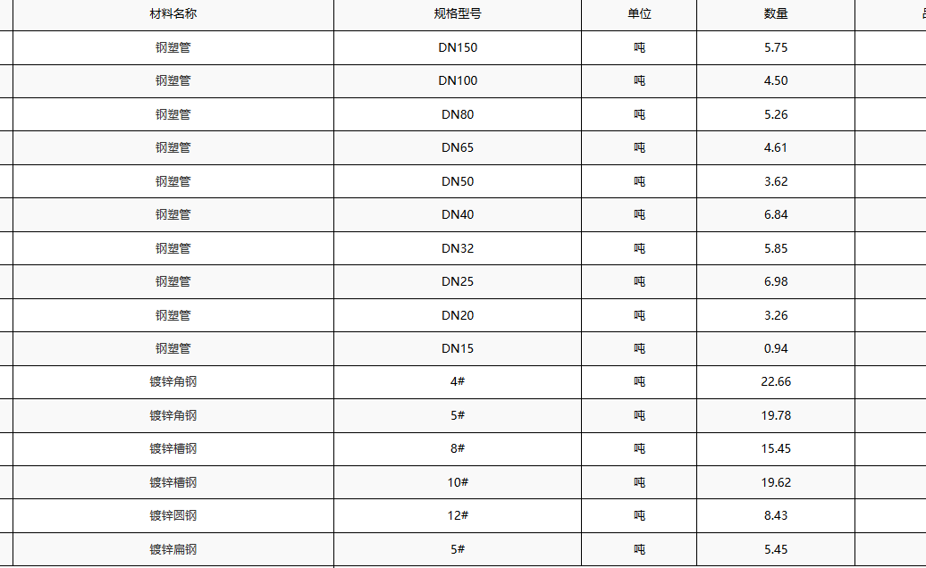 1、浙江嘉兴水电安装工程采购一批材料,包含钢塑管,规格DN15-150,4#5#镀锌角钢,8#10#镀锌槽钢,12#镀锌圆钢,5#镀锌扁钢,共计139吨。