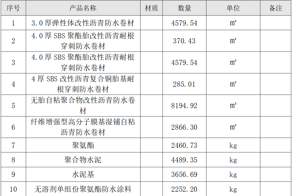 | 项目描述 | 1、浙江宁波精密机械车间迁建工程采购防水材料,主要包含弹性体改性沥青防水卷材,SBS改性沥青防水卷材,自粘聚合物改性沥青防水卷材,聚氨酯,无溶剂单组份聚氨酯防水涂料等。 2、付款防水为供货完毕支付至结算款项的80%,材料安装完毕验收后支付至最终结算款项的97%,3%质保金项目竣工结束后6个月内付清,具体要求参考清单,采购人联系人:王工。 |