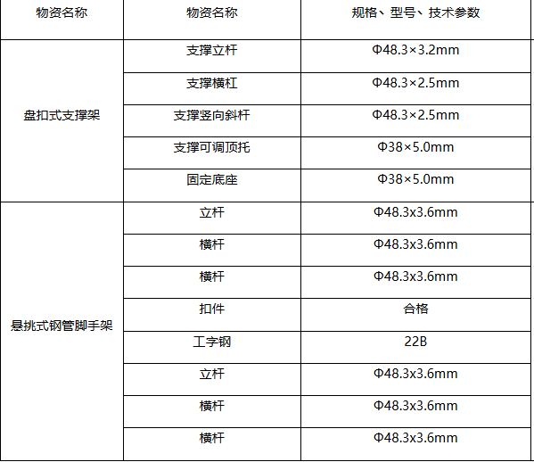 2、临建工程需要钢管脚手架及模板支撑架,主要为盘扣式支撑架和悬挑式钢管脚手架,具体规格见清单,联系人:陈工。
