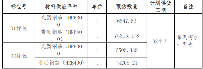 | 项目描述 | 安徽淮南高速公路工程钢筋采购计划如下: 采购总数量约162580.847T,其中包括HPB300钢筋、HRB400钢筋,数量见采购需求表。包含采购、运输、交接验收等,采购工期32个月。 |