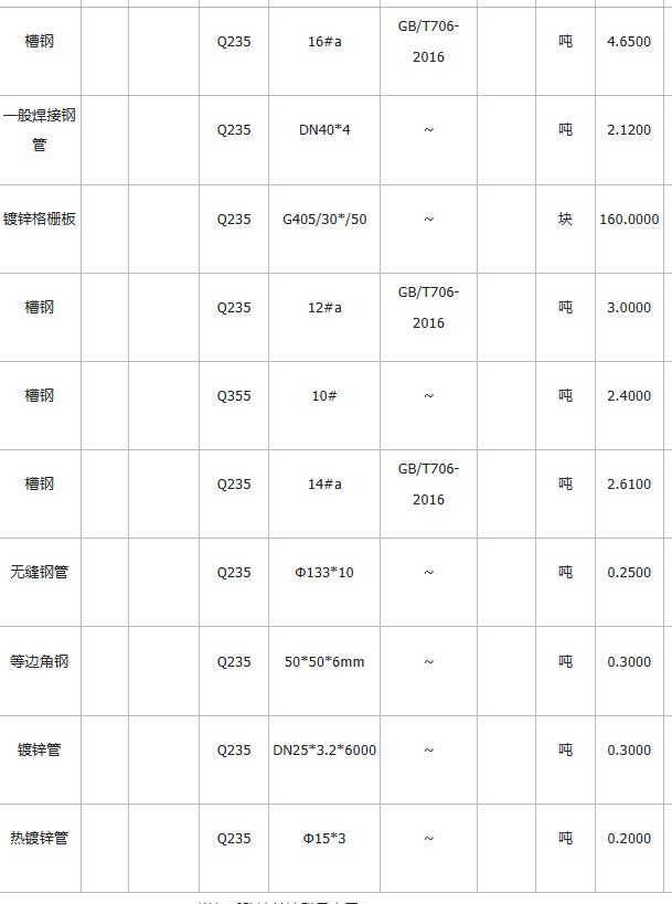 | 项目描述 | 四川攀枝花钢结构工程采购一批钢材,主要包含槽钢,焊接钢管,镀锌格栅板,无缝钢管,等边角钢,镀锌管,热镀锌管等,具体规格采购数量请厂家参考清单报价。 |