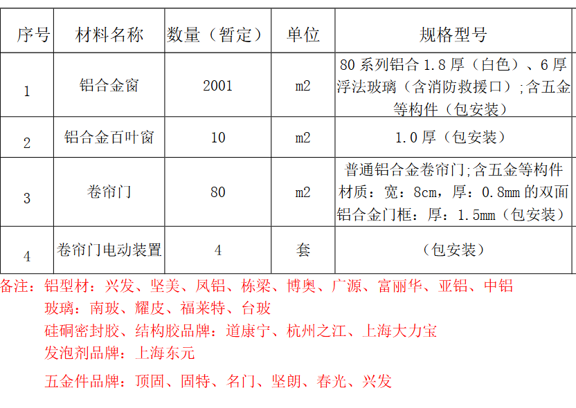 | 项目描述 | 浙江宁波北厂房项目采购铝合金门窗材料,主要包含80系列1.8 厚,6厚浮法玻璃,含五金构件,1.0厚铝合金百叶窗,铝合金卷帘门、框等,具体规格数量见清单,采购联系人:刘工。 |