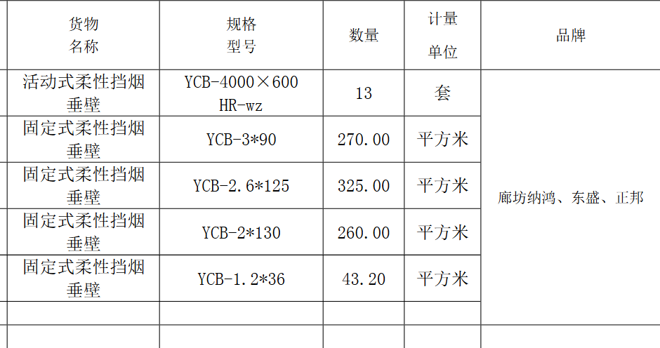 | 项目描述 | 1、浙江丽水茶叶产业园建设项目,总建筑面积52618.37㎡,主要建设内容为7栋标准化商贸用房,1栋展销中心,1栋服务中心。 2、机电安装工程需要采购一批活动式和固定式柔性挡烟垂壁,具体规格数量见清单,品牌廊坊纳鸿、东盛、正邦。 3、货款结算支付方式为货到工地验收合格30天内付到95%,90天内付清,请专业厂家联系合作,采购人:毛经理。 |