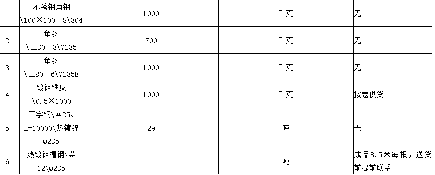 | 项目描述 | 安徽阜阳车间改造工程采购一批钢材,主要包含304不锈钢角钢1吨,规格为100×100×8mm,30×3和80×6角钢1.7吨,0.5×1000镀锌铁皮,25#工字钢29吨,12#热镀锌槽钢11吨,型材材质为Q235B,具体参考清单报价,联系人:丁经理。 |