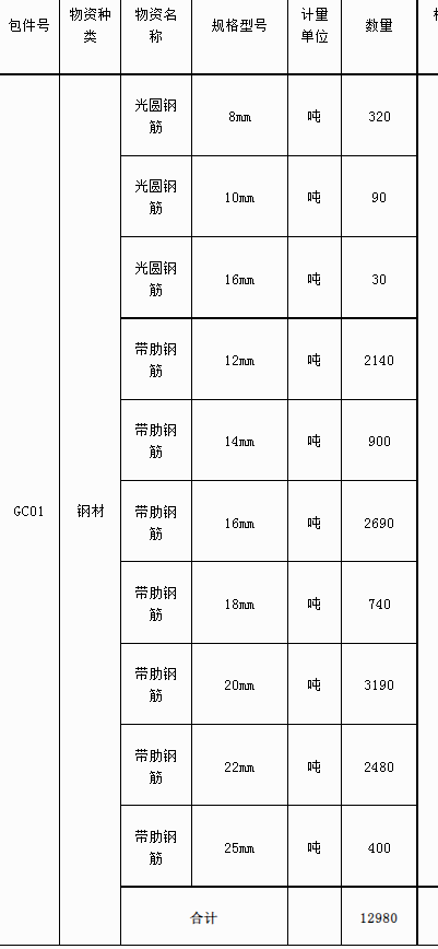 | 项目描述 | 陕西省绥德县铁路工程钢材采购计划如下: 本工程总采购数量约12980吨,其中光圆钢筋:规格为8mm采购320吨,10mm采购90吨,16mm采购30吨;带肋钢筋:规格12mm采购2140吨,14mm采购900吨等详情参考采购清单,联系人:王总。 |