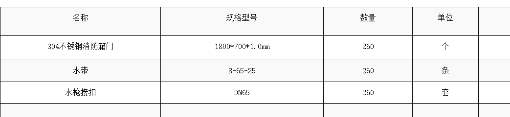 | 项目描述 | 浙江宁波水电消防安装工程采购材料,主要包含304不锈钢消防箱门,规格要求1800*700*1.0mm,配套水带,水枪接扣规格DN65,共计260套,具体规格型号见表格,联系人:季经理。 |