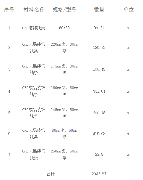 | 项目描述 | 四川眉山安置房装饰工程采购GRC装饰条,主要规格包含160mm宽,50mm厚,80mm宽,50mm厚,145mm宽,50mm厚等多种,具体采购量请参考清单,联系人:谢工。 |