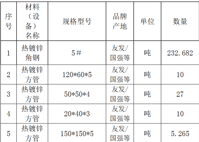 | 项目描述 | 1、江苏昆山住宅建设项目,主要新建1~8#住宅楼、9~13#住宅楼、15#住宅楼、16~21#住宅楼、23~24#住宅楼,配套社区物业用房等。 2、幕墙工程需要采购5#角钢,150*150*5方管,120*60*5方管,50*50*4方管,20*40*3方管,表面热镀锌,具体规格见清单,采购人:毕工。 |