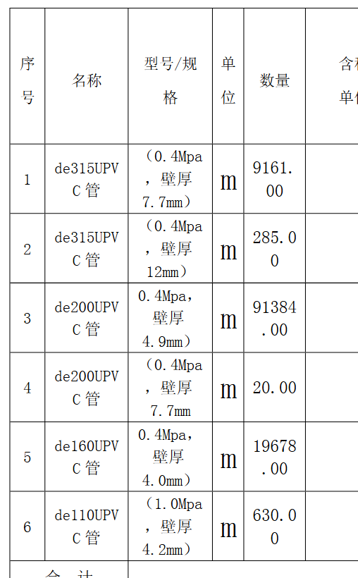 | 项目描述 | 新疆阿克苏产业园市政工程采购管材,主要包含de315UPVC管,壁厚7.7/12mm,e200UPVC管,壁厚4.9/7.7mm,de160UPVC管,壁厚4.0mm,de110UPVC管,壁厚4.2mm,详细采购数量见清单,联系人:洪工。 |